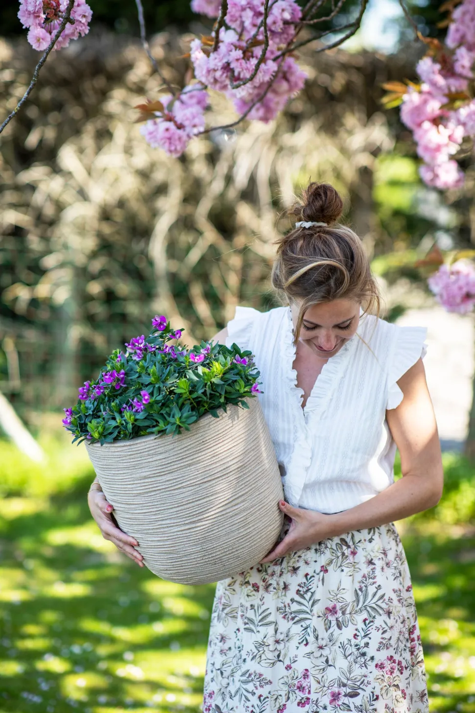 Das Material, aus dem dieser Blumentopf hergestellt ist, ist Kunststoff, so dass er nicht zerbrechlich und zudem ein Leichtgewicht ist. Er hat einen Durchmesser von 43 und eine Höhe von 41 cm.