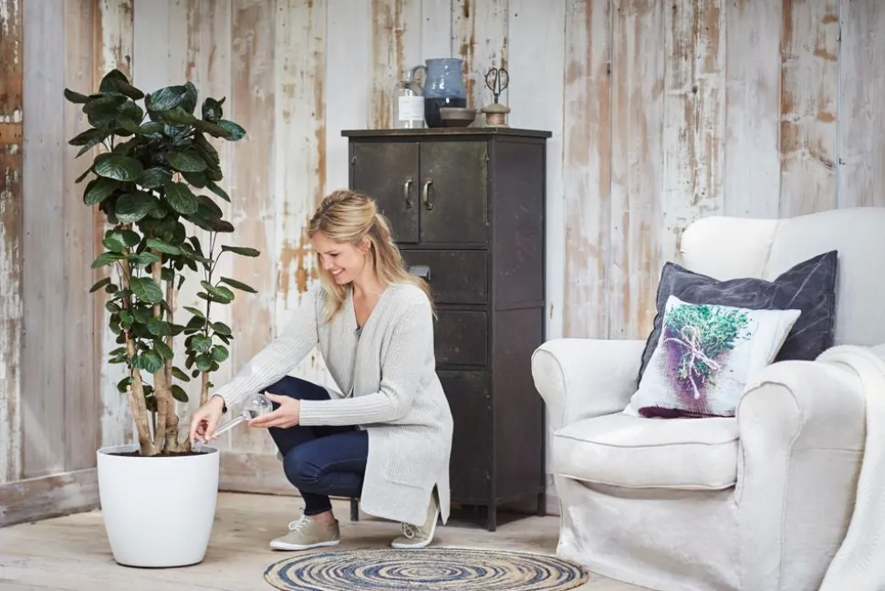 Einfach und schnell: Fülle die Bewässerungskugeln mit Wasser und stecke sie leicht schräg in die Blumenerde der Pflanze bis zu den Wurzeln. Dann gibt der Aqua Care Wasserspender das Wasser ab, sobald die Pflanze es braucht. Die Bewässerungskugeln sind aus unzerbrechlichem Material gefertigt und hat einen breiten Auslauf, damit er nicht mit Blumenerde verstopft: Gut durchdacht!