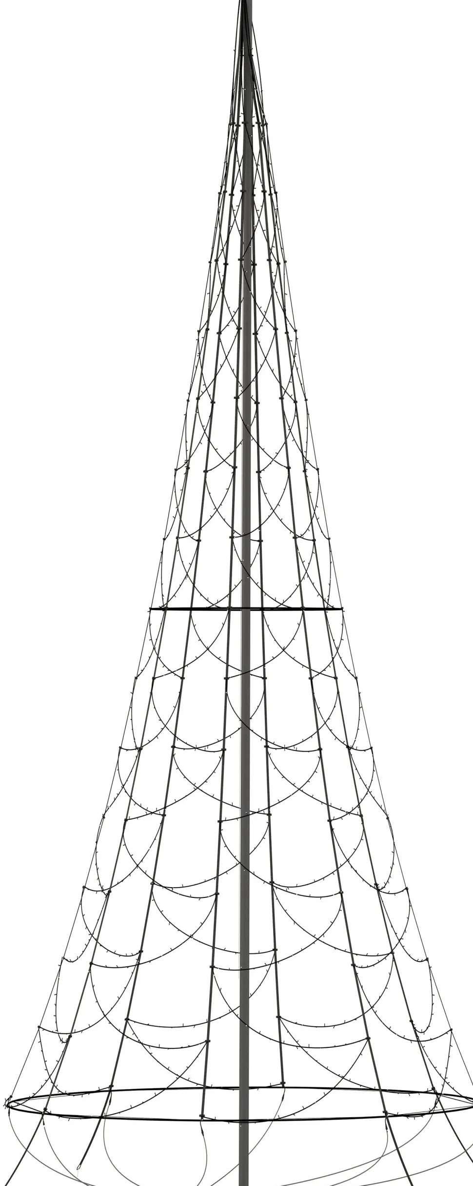 Zum Aufstellen der Fahnenmast-Lichterpyramide wird kein Werkzeug benötigt. In nur 10 bis 15 Minuten steht der Lichterbaum mit seinen 1200 bunten LED-Lämpchen. Die Maße dieser Fahnenmast-Beleuchtung betragen: 300 x 600 cm.