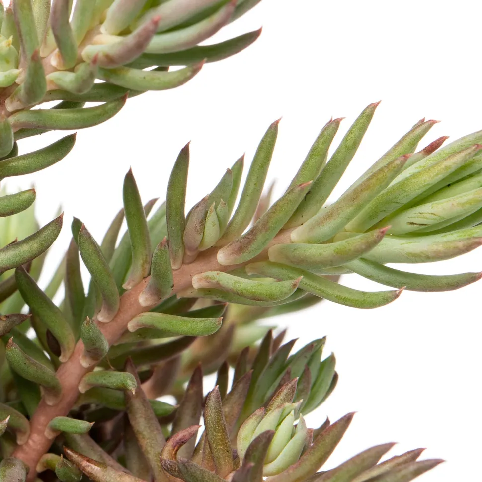 Eine Sedumart mit kleinen, spitzen Blättern, die wie der Ast einer Konifere aussehen. Dieses Sedum hat im Sommer gelbe Blüten. Ein Bodendecker, der zu einer schönen Matte werden kann.