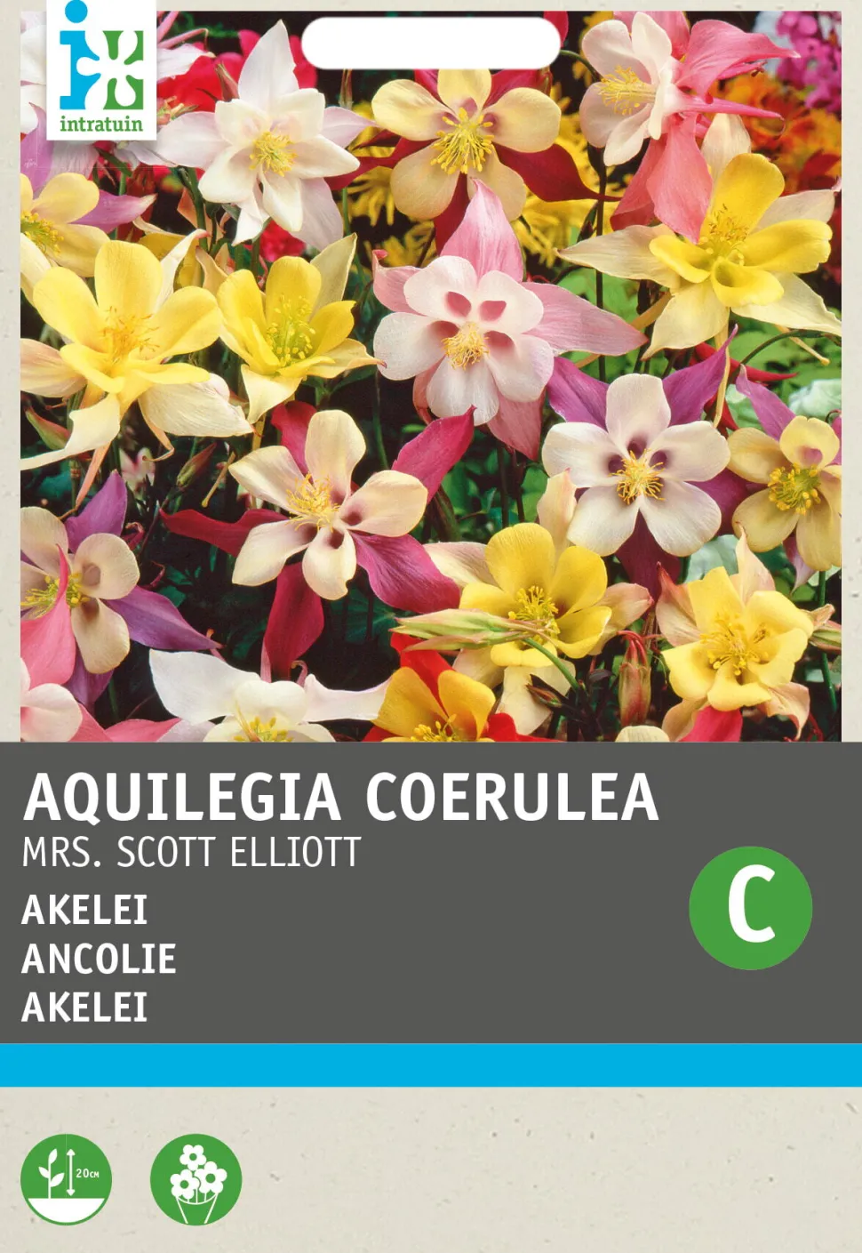 Akelei ‚Mrs. Scott Elliot‘ ist eine Sorte mit gemischten Blütenfarben in Gelb- und Rottönen. Die Blüten blühen im Frühling und sind zweifarbig. Sie sind mehrjährig und blühen nicht im ersten Jahr. Die Blätter sind blaugrün und bilden eine Rosette, über der die Blüten an kräftigen Stängeln wachsen. Sie mögen hellen Schatten und feuchten Boden, obwohl sie auch andere Bedingungen vertragen.