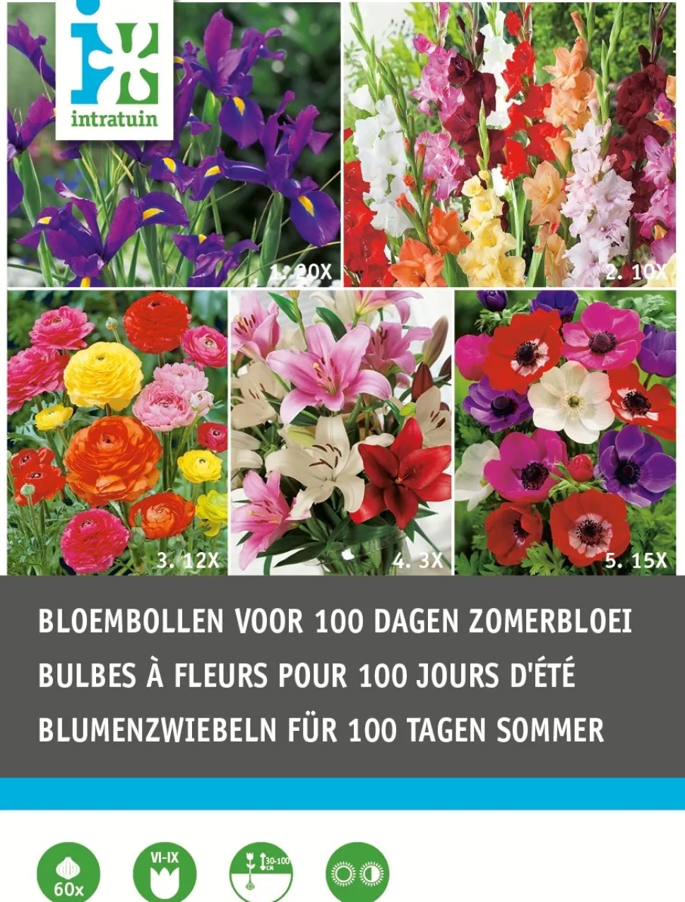 Diese Mischung aus Zwiebeln sorgt im Sommer für monatelange Blütenpracht im Garten. Die Pflanzzeit ist von März bis Mai, wenn kein strenger Frost mehr zu befürchten ist. Im Juni blühen die Schwertlilien als erste in der Farbe Lila, danach wachsen nach und nach die anderen Zwiebeln in gemischten Farben. Die maximale Höhe beträgt 90 cm. Die Zwiebeln können in der Erde gelassen werden, damit sie auch in den Folgejahren ein Farbspektakel bieten und weiter wachsen. Diese Blumen sind auch als Schnittblumen geeignet. Indem du die verwelkten Blüten immer wieder abschneidest, blühen diese Pflanzen länger.