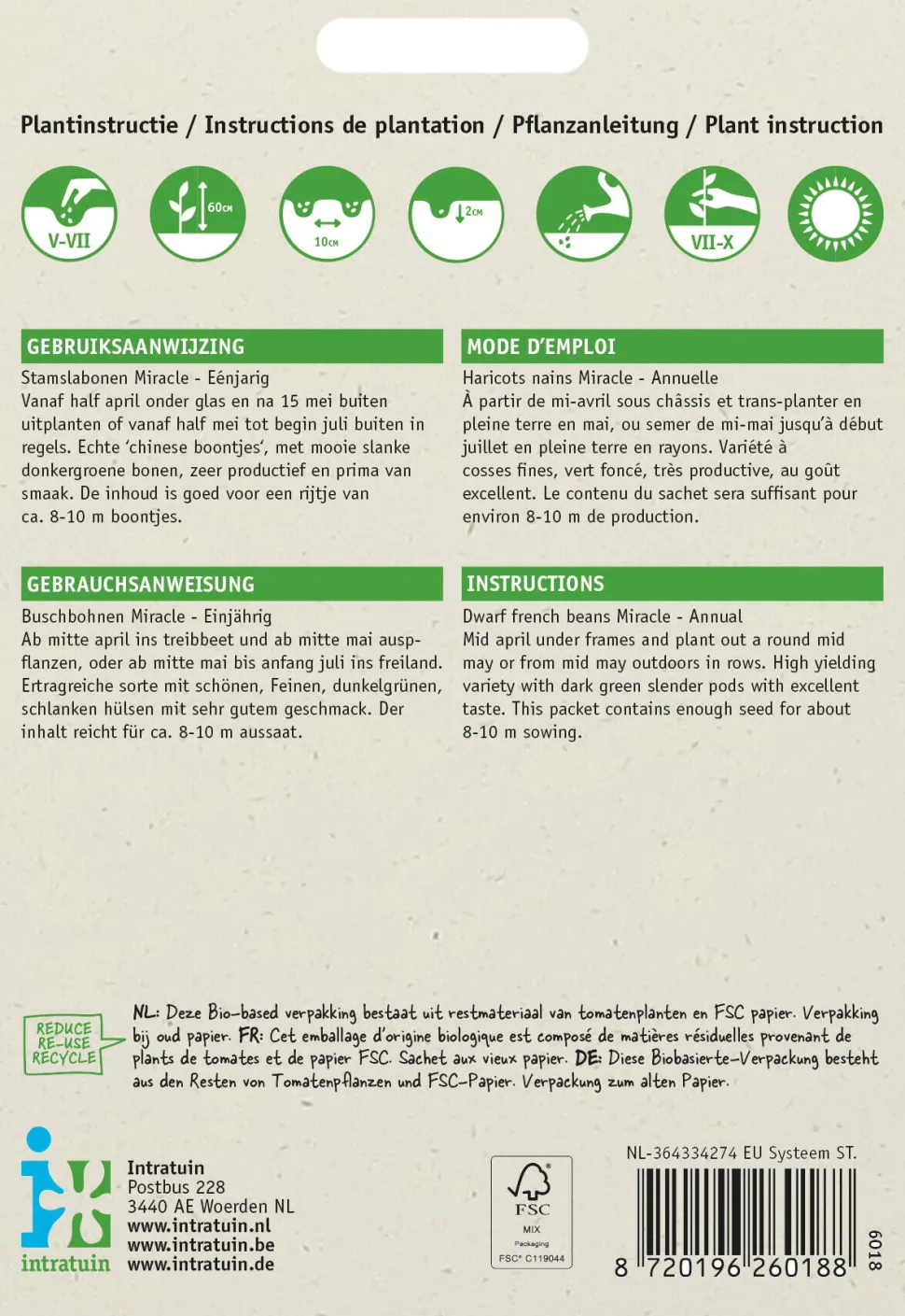 Die Buschbohne ‚Miracle‘ liefert eine große Menge feiner, runder, 10-12 cm langer Schoten, die gut schmecken und keine Fäden haben. Sie sind dunkelgrün und widerstandsfähig gegen schlechtes Wetter. Die Aussaat kann Mitte Mai im Freiland erfolgen, bei ausreichend hohen Temperaturen und feuchtem Boden. Die Höhe wird etwa 60 cm. Pflücke die Bohnen jung, damit sie zart bleiben und die Pflanzen weiter produzieren. Geerntet wird im Juli-August.