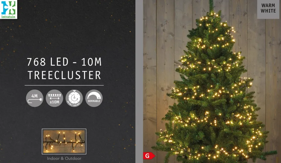 Diese Cluster-Lichterkette ist 10 m lang und mit 768 LEDs ausgestattet, die ein warmweißes Licht abgeben. Die schöne Büschellichterkette ist für Außen geeignet und lässt sich als Weihnachtsbaumbeleuchtung für Bäume mit einer Höhe von 1,6 bis 1,9 m. In Kombination mit dem Intratuin Dimmer für LED-Clusterbeleuchtung (EAN 8713619391118) ist diese Cluster-Lichterkette für außen auch dimmbar.