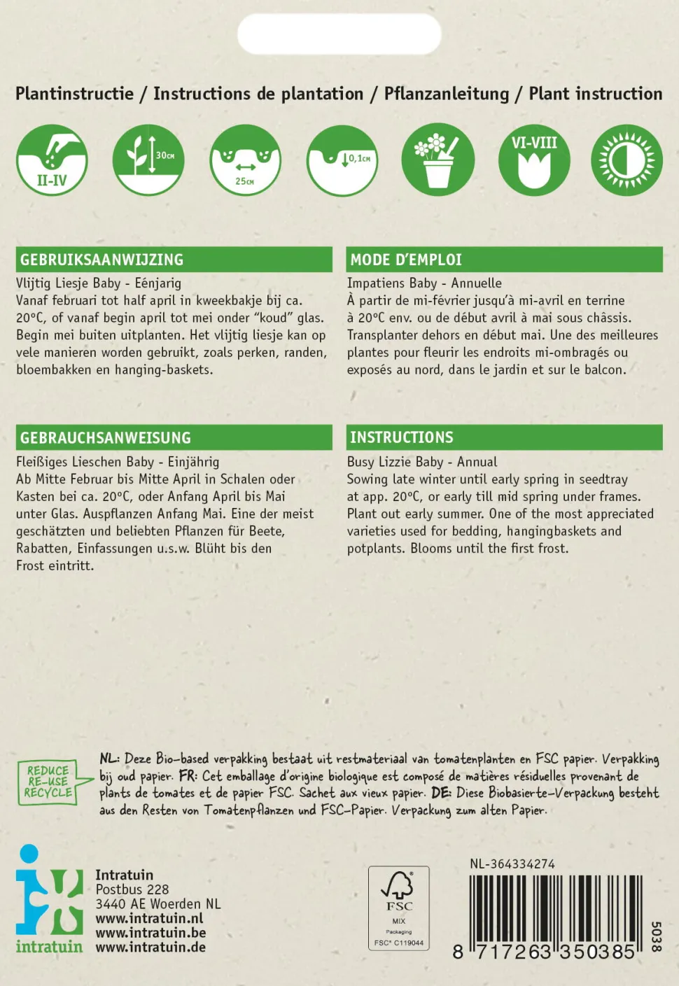 Das Fleißige Lieschen ‚Nana Baby‘ ist eine niedrig bleibende Sorte, die nicht höher wächst als 30 cm. Wie der Name bereits vermuten lässt, blüht das Fleißige Lieschen üppig und lange, ohne viel Pflege zu benötigen. Es ist eine der wenigen Beetpflanzen, die auch im Schatten gedeiht und selbst bei Regenwetter lange blüht. Am wohlsten fühlt sich das Fleißige Lieschen in leicht feuchtem Boden. Schon bei leichtem Frost gefrieren die wasserreichen Stängel direkt. Das Fleißige Lieschen ist eine extrem vielseitige Gartenblume: Du kannst sie an den Rand von Beeten pflanzen, in den Halbschatten rund um Bäume oder Pflanzen, in Pflanzkübel und Blumenkästen ebenso wie in Balkonkästen.