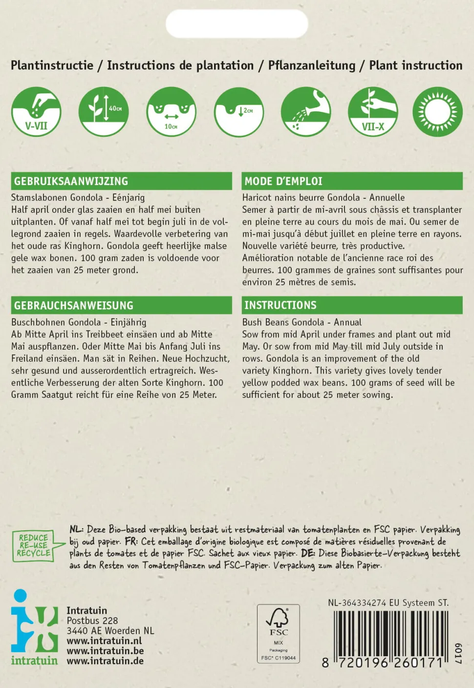 Mitte April im Gewächshaus aussäen und Mitte Mai ins Freiland pflanzen. Oder von Mitte Mai bis Anfang Juli direkt im Garten in Reihen aussäen. Wertvolle Verbesserung der alten Sorte Kinghorn. Gondola produziert köstliche zarte gelbe Buschbohnen. 100 Gramm Samen reichen aus, um 25 Meter Boden auszusäen.