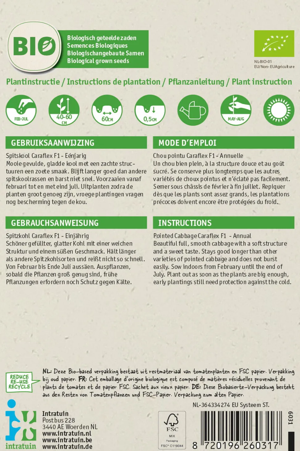 Dieser Weißkohl hat eine spitze Form und der Kopf ist weniger fest als beim normalen Weißkohl. Die Aussaat kann bereits im Februar bis Mitte März unter Glas erfolgen, wobei die Pflanzen im März oder April im Abstand von 50 x 50 cm ausgepflanzt werden. Von April bis Mai kann die Aussaat im Freiland in einem Saatbeet erfolgen, wobei die Pflanzen 6 Wochen später ausgepflanzt werden. Dieser Spitzkohl wächst besonders schnell in etwas leichteren Böden. Achte darauf, dass der Boden nicht austrocknet, da die Kohlköpfe sonst brechen können. Die frühe Ernte kann bereits im Juli eingebracht werden.
