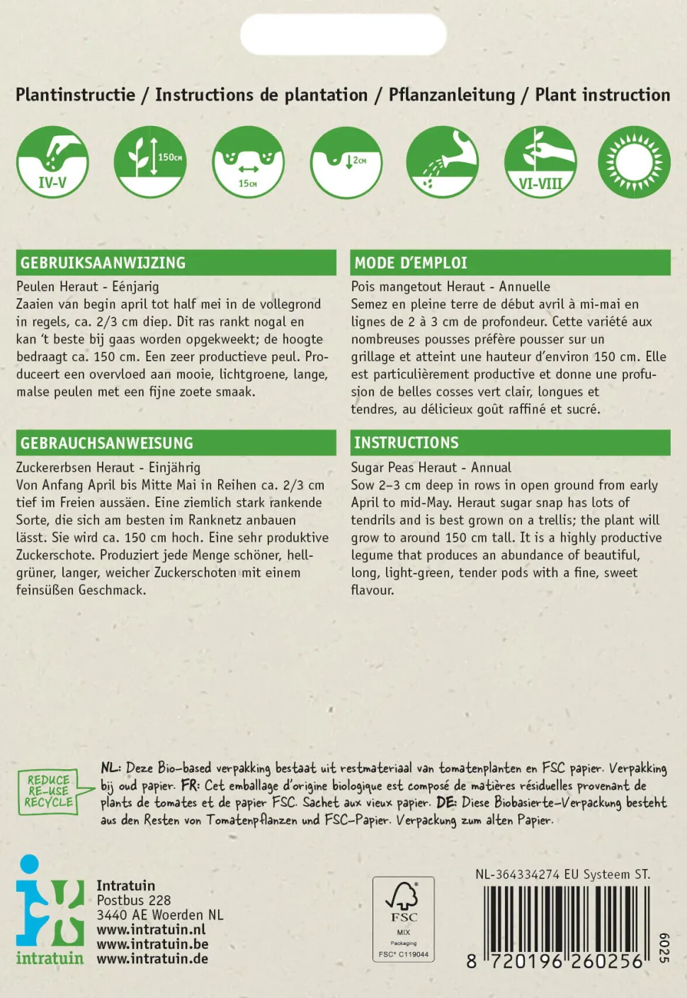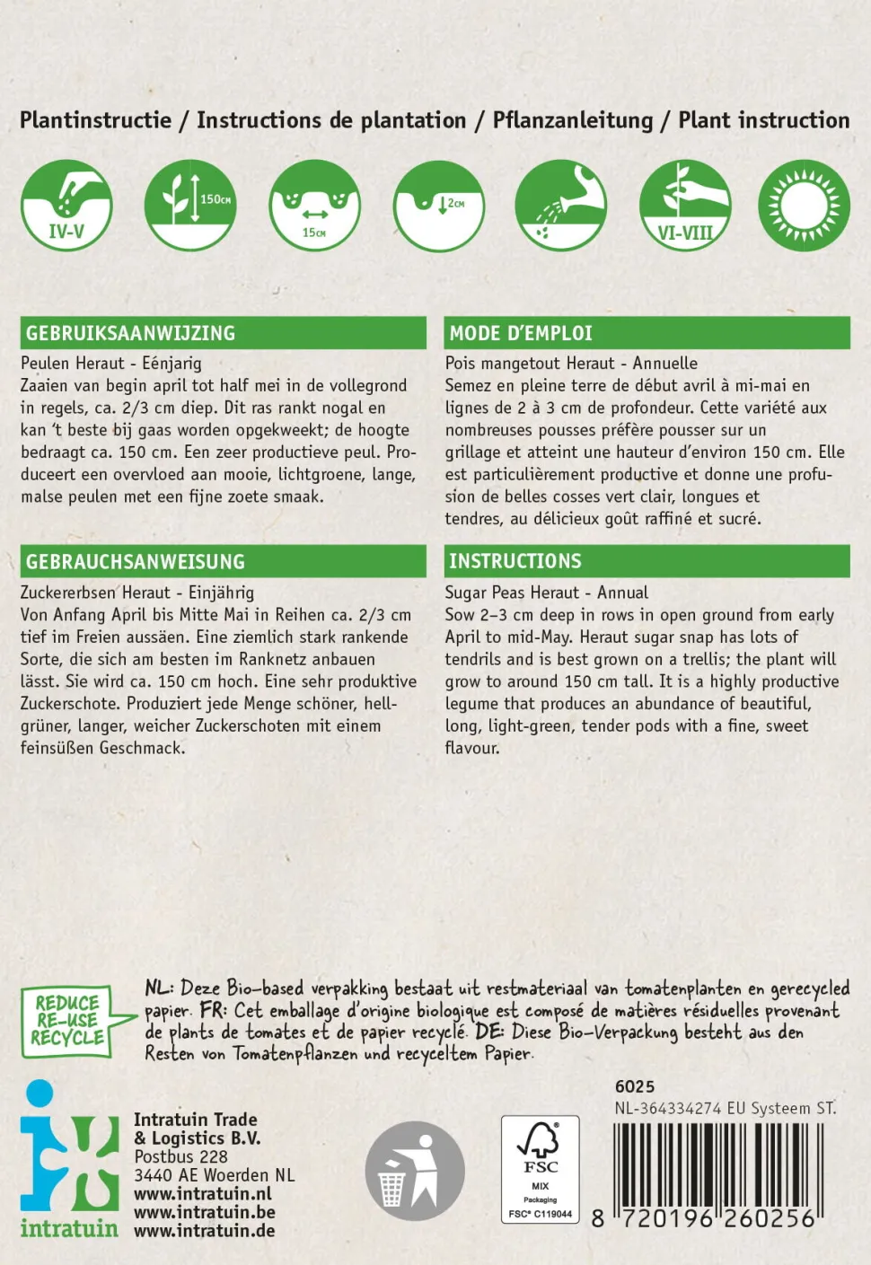 Aussaat von Anfang April bis Mitte Mai im Garten in Reihen, ca. 2/3 cm tief. Diese Sorte neigt zum Ranken und wird am besten beim Wachstum begeleitet, sprich unterstützt. Die letztendliche Wuchshöhe beträgt ca. 150 cm. Eine sehr ertragreiche Schote. Produziert eine Fülle von schönen, hellgrünen, langen, zarten Schoten mit einem feinen süßen Geschmack.