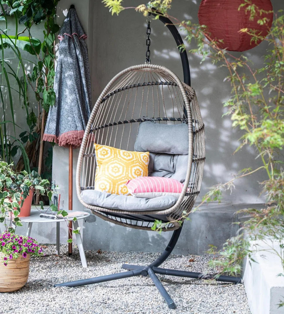 Der Hängesessel ist auch hochwertigen Materialien gefertigt und kann das ganze Jahr hinweg draußen stehen bleiben. Wir empfehlen, den Hängesessel zweimal pro Jahr mit dem Intratuin Gartenmöbel Reiniger und Schutz zu behandeln. Diese speziellen Pflegemittel für Gartenmöbel enthalten einen UV-Filter, der Verfärbungen und witterungsbedingter Abnutzung vorbeugt.