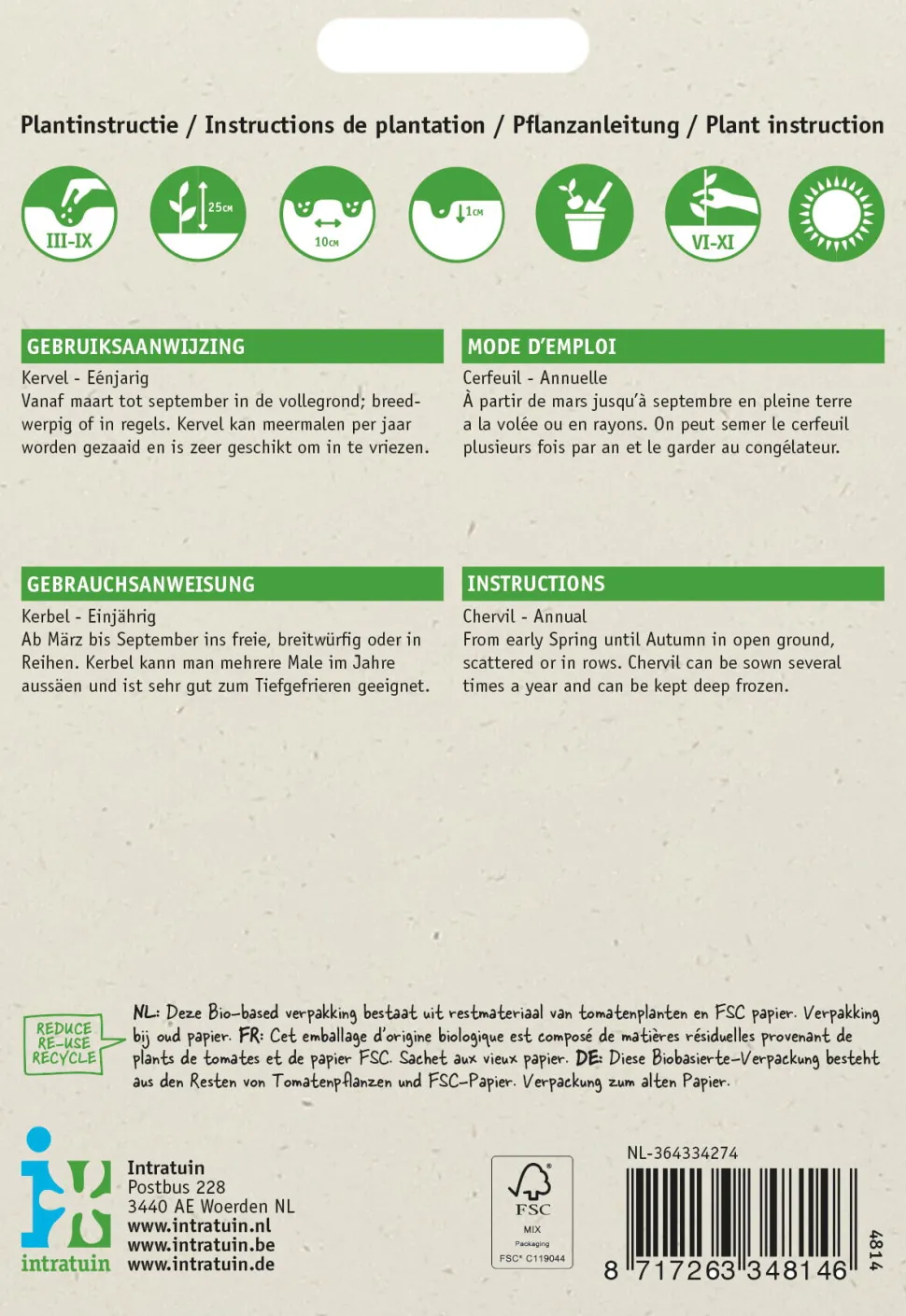 Dieser ‚Echte‘ Kerbel Anthriscus cerefolium ist ein einjähriges Kraut, der allerdings auch etwas Kälte verträgt. Die Kerbel-Samen kannst du ab April direkt draußen in dein Kräuterbeet säen. Wenn du kontinuierlich eine kleine Menge der Kerbelsamen ausbringst, kannst du von Juni bis Oktober ernten. Der Kerbel kann sowohl frisch als auch getrocknet verarbeitet werden und lässt sich auch gut einfrieren. Der ‚Krause‘ Kerbel hat einen milderen Geschmack als der ‚Echte‘ Kerbel.