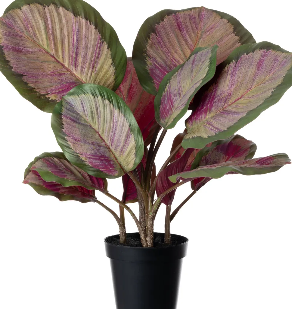 Diese künstliche Calathea-Pflanze von Intratuin ist aus Kunststoff und hat eine schöne Höhe (44 cm), um eine gemütliche Ecke zu schaffen und zu „begrünen“. Die Blattfarbe ist rosa und grün.