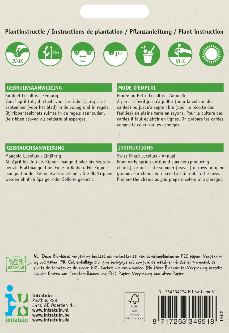| Besonderheiten | Der ‚Lucullus‘-Mangold bildet köstliche Blätter, die sich wie Spinat essen, aber wenn man wartet, kann man auch die Stängel wie Spargel essen. Schneide die Blätter ein paar Zentimeter über dem Boden ab, dann treiben die Stängel wieder aus. |