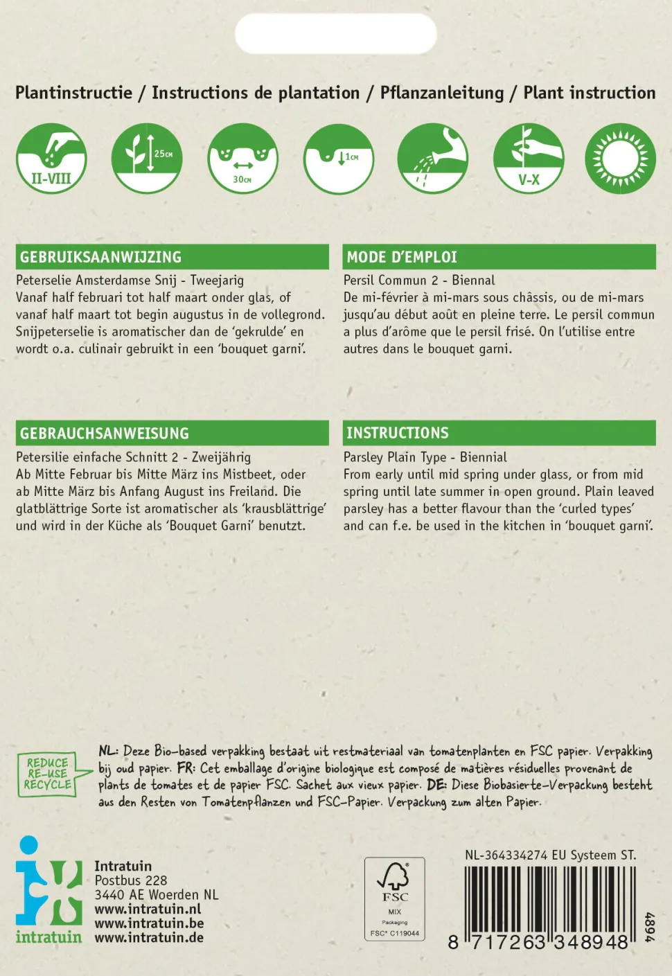 Diese Petersilie ist eine 2-jährige Pflanze, die den Winter aber nicht immer überlebt. Im zweiten Jahr beginnt die Pflanze zu blühen, sie kann bis zur Blüte geerntet werden. Petersilie kann auch in Töpfen ausgesät und das ganze Jahr über im Haus angebaut werden. Die beste Temperatur für die Keimung ist 27 Grad Celsius, die Samen können auch eingeweicht werden. Bei Temperaturen über 5 Grad Celsius ist es auch möglich, aber es dauert länger. Petersilie ist ein weit verbreitetes Küchenkraut mit einem frischen und würzigen Geschmack, der gut zu Suppe, Salat und Knoblauchbutter passt. Für warme Gerichte fügst du die fein gehackten Blätter erst in der letzten Minute hinzu und kochst sie nicht mit dem Gemüse. Der Geschmack ist dann am stärksten.