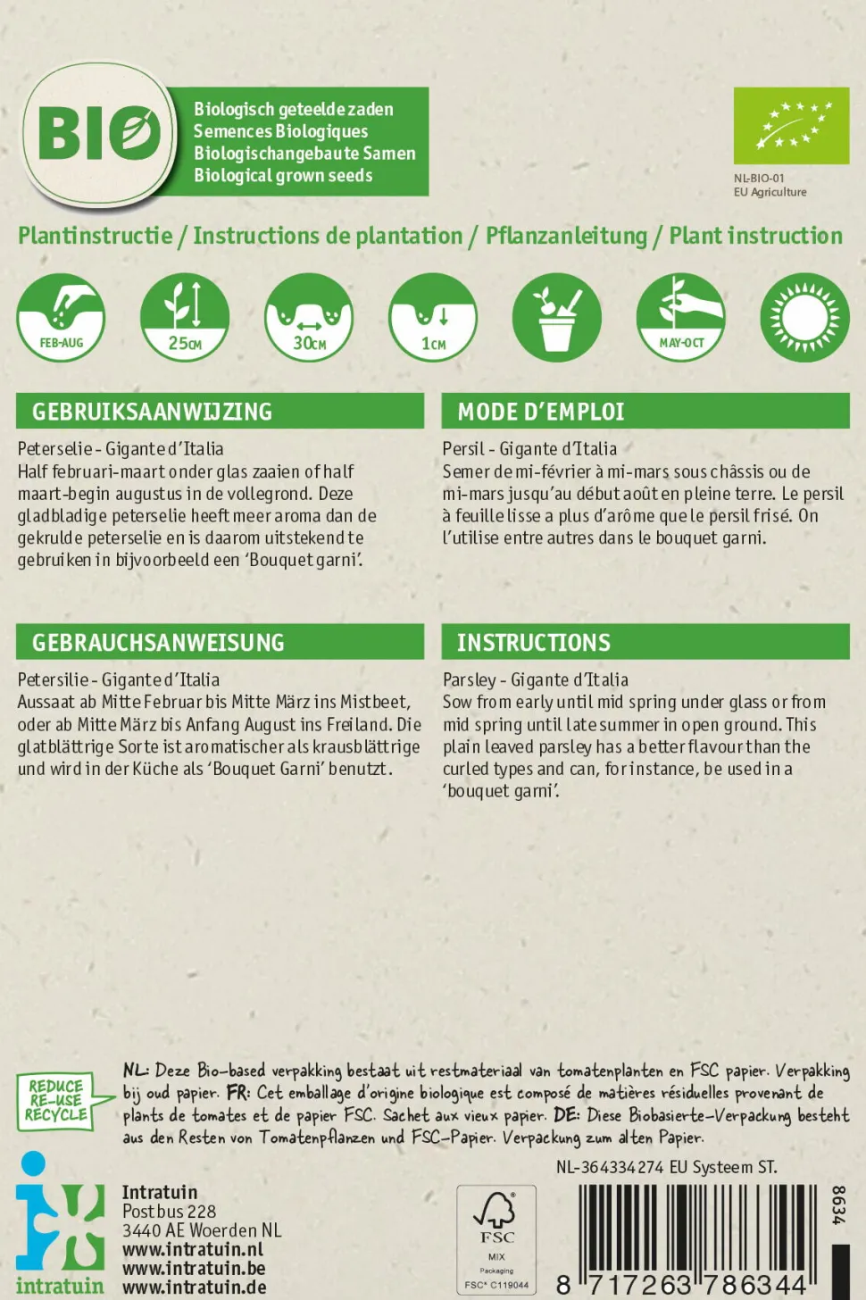 Diese Petersilie ist eine 2-jährige Pflanze, die den Winter aber nicht immer überlebt. Im zweiten Jahr beginnt die Pflanze zu blühen, sie kann bis zur Blüte geerntet werden. Petersilie kann auch in Töpfen ausgesät und das ganze Jahr über im Haus angebaut werden. Die beste Temperatur für die Keimung ist 27 Grad Celsius, die Samen können auch eingeweicht werden. Bei Temperaturen über 5 Grad Celsius ist es auch möglich, aber es dauert länger. Petersilie ist ein weit verbreitetes Küchenkraut mit einem frischen und würzigen Geschmack, der gut zu Suppe, Salat und Knoblauchbutter passt. Für warme Gerichte fügst du die fein gehackten Blätter erst in der letzten Minute hinzu und kochst sie nicht mit dem Gemüse. Der Geschmack ist dann am stärksten.