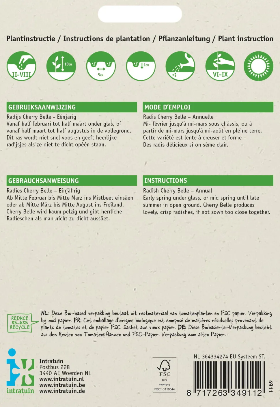 Wir kennen das Radieschen für seinen würzigen und frischen Geschmack, köstlich als Snack oder in einem Salat. Radieschen sehen rund aus, aber eigentlich ist es die verdickte Wurzel der Pflanze. Lass die Knolle nicht zu groß werden, sonst wird sie mehlig im Geschmack. Ein Radieschen enthält kein Fett, wenig Kalorien und viele Ballaststoffe – ein leckerer gesunder Snack. Die meisten Radieschen haben eine rote Farbe, aber es gibt auch gelbe, weiße oder rosa Sorten. Die Sorte ‚Cherry Belle‘ ist gleichmäßig rot und schön rund.