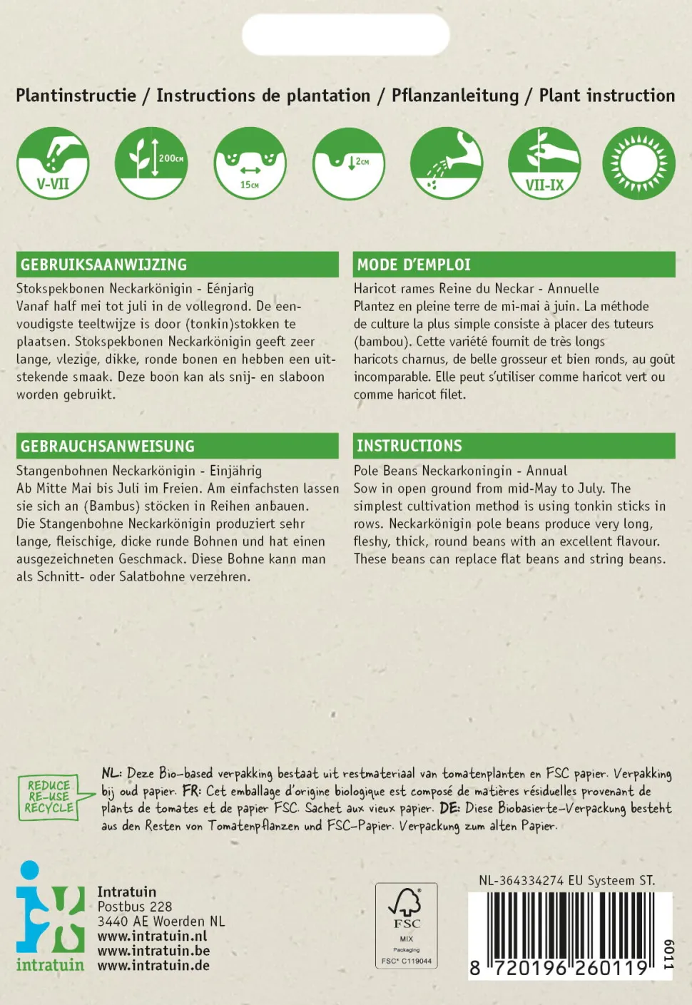 Stangenbohnen ‚Neckarkönigin Phenom‘ wachsen etwas größer und fleischiger als die gewöhnlichen Bohnen. Es handelt sich um eine Kletterpflanze, die Unterstützung z.B. durch Pfähle oder Gitter benötigt. Die Ranken befestigen sich selbst und winden sich um Stangen. Sie können mehr als 2 Meter hoch werden, was auch eine üppige Ernte über einen längeren Zeitraum ermöglicht. Ab Mitte April kannst du die Samen im Haus vorsäen und ab Mitte Mai ins Freie pflanzen. Auf diese Weise bist du weniger wetterabhängig und kannst die Keimung besser kontrollieren. Im Freiland säst du von Mitte Mai bis Juli 3-4 Samen pro Stock in einer Tiefe von 3 cm aus. Der Abstand zwischen den Stöcken beträgt 150 x 50 cm. Die Ernte ist von Ende Juli bis Oktober möglich.