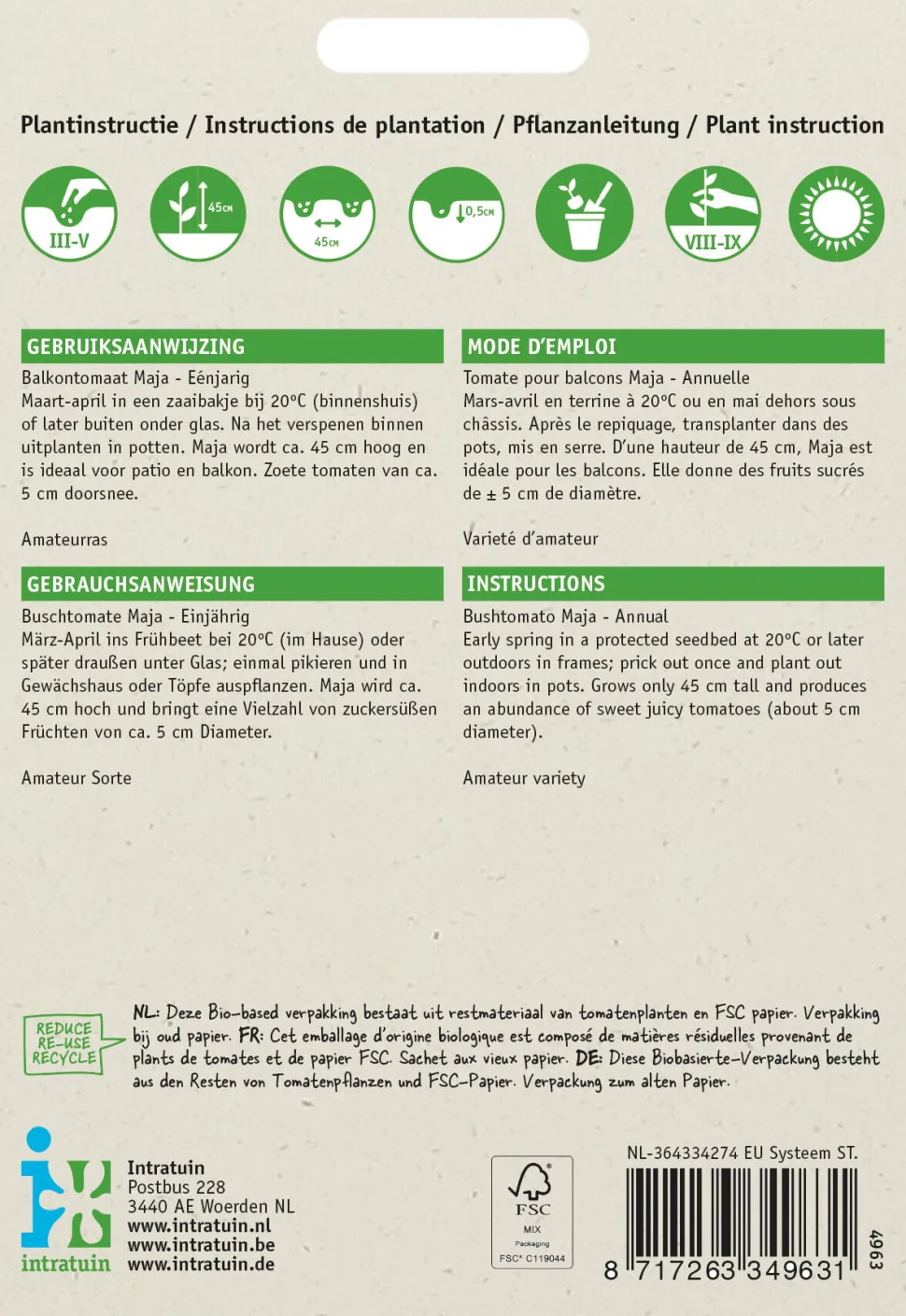 Bei der Tomatensorte ‚Maja‘ handelt es sich um eine klein bleibende Tomatensorte, die eine große Anzahl an roten, runden Tomaten hervorbringt. Die Früchte haben einen Durchmesser von etwa 5 cm und einen sehr guten Geschmack. Die Tomatenpflanzen werden ca. 45 cm hoch und eignet sich daher auch ideal für den Anbau auf einer sonnigen Terrasse oder auf dem Balkon. Säe die Tomatensamen am besten Anfang März in einem Anzuchtkasten oder in Anuchttöpfen bei 20° C aus. Nach dem Pikieren im April wachsen die Tomatenpflanzen zu kräftigen Pflanzen heran, die schließlich ins Gewächshaus oder in einen großen Topf gepflanzt werden. Warte mit dem Auspflanzen bis nach Mitte Mai und gewöhne die Pflanzen schrittweise an die niedrigeren Temperaturen. Die Sorte ‚Maja‘ ist auch für die Freilandkultur an einem sonnigen, geschützten Platz geeignet. Die behaarten Stängel der Tomatenpflanzen sind anfällig für Schimmel und sollten daher möglichst trocken gehalten werden. Aus diesem Grund werden Tomaten oft unter einem möglichst lichtdurchlässigen Vordach angebaut.