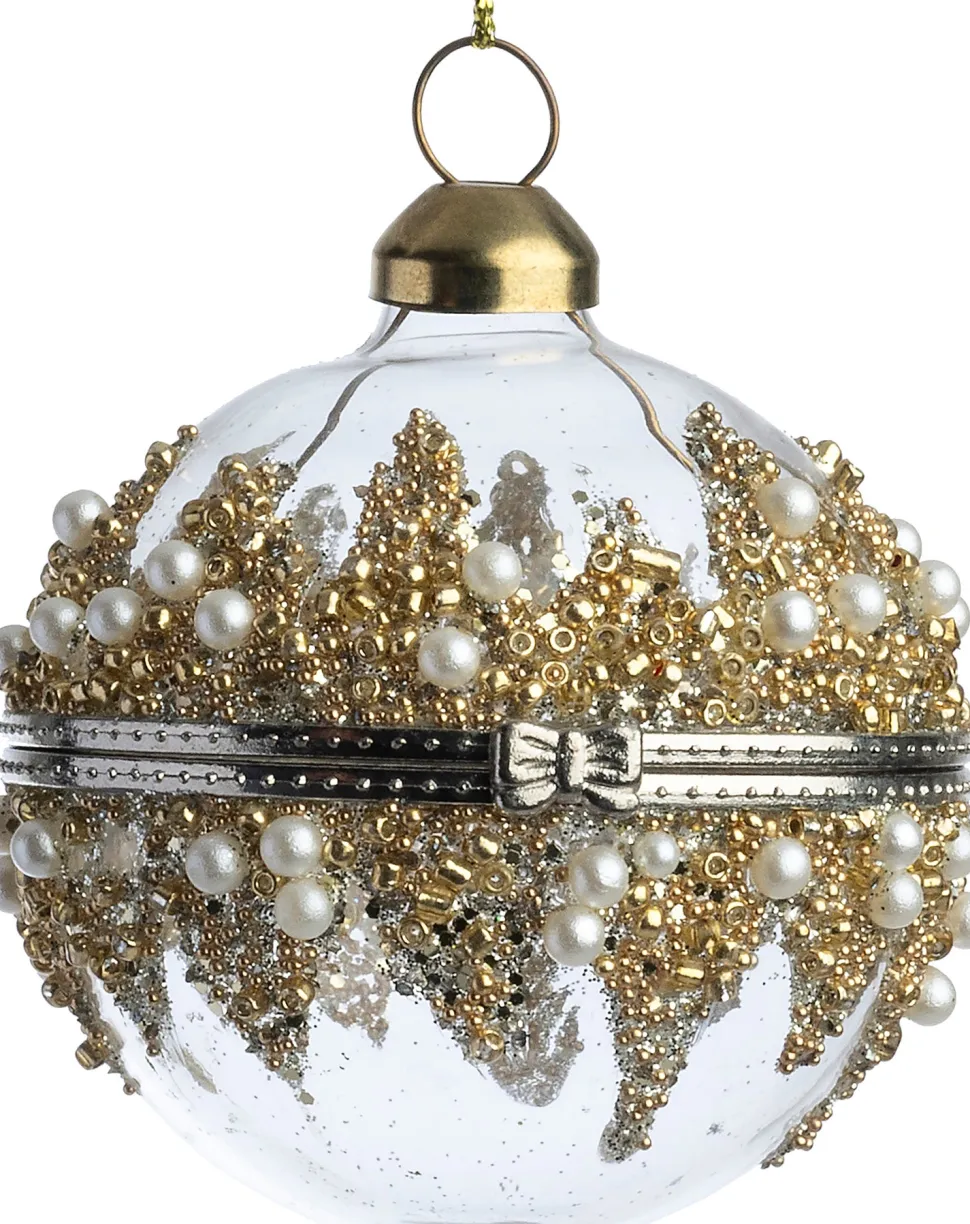 Aber da ist noch mehr: Da sich diese Weihnachtsdekoration öffnen lässt, kannst du sie auch auf originelle Weise einsetzen. Verstecke ein kleines Geschenk, eine persönliche Nachricht oder einen besonderen Wunsch in der Kugel und hänge sie in den Baum. Am Heiligabend wird es dann eine Überraschung sein, zu entdecken, was darin steckt. Du kannst die Kugel auch als einzigartige Verpackung für Schmuck oder als dekorative Schachtel bei einem Weihnachtsessen verwenden. Lege sie auf ein Tablett zwischen Kerzen und Tannenzapfen oder verwende mehrere Kugeln als Tischdekoration. Durch die Perlenverzierung und den schimmernden Goldglitter fängt die Kugel das Licht wunderschön ein und sorgt für eine warme und festliche Atmosphäre in deinem Zuhause.