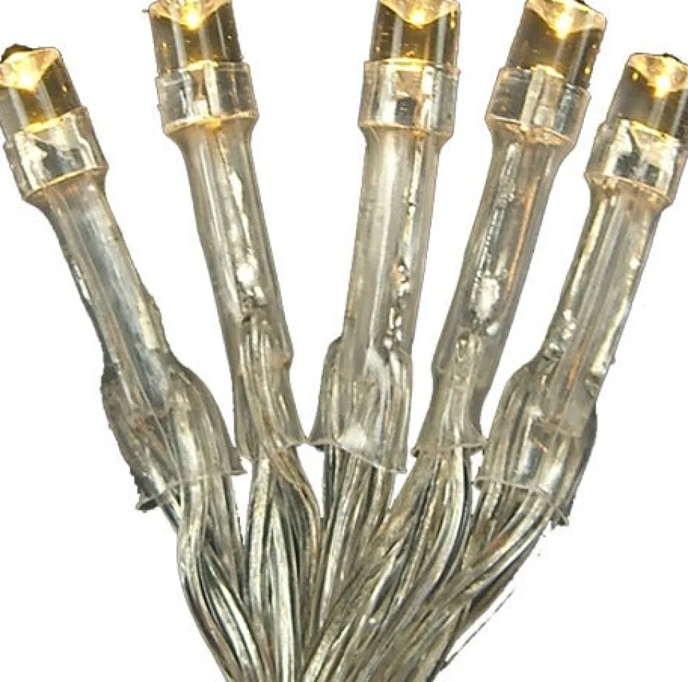 Diese Innen-Lichterkette ist batteriebetrieben, hat kleine LED-Lichter, die warmweißes Licht erzeugen, ist 2 m lang und hat ein transparentes Kabel.