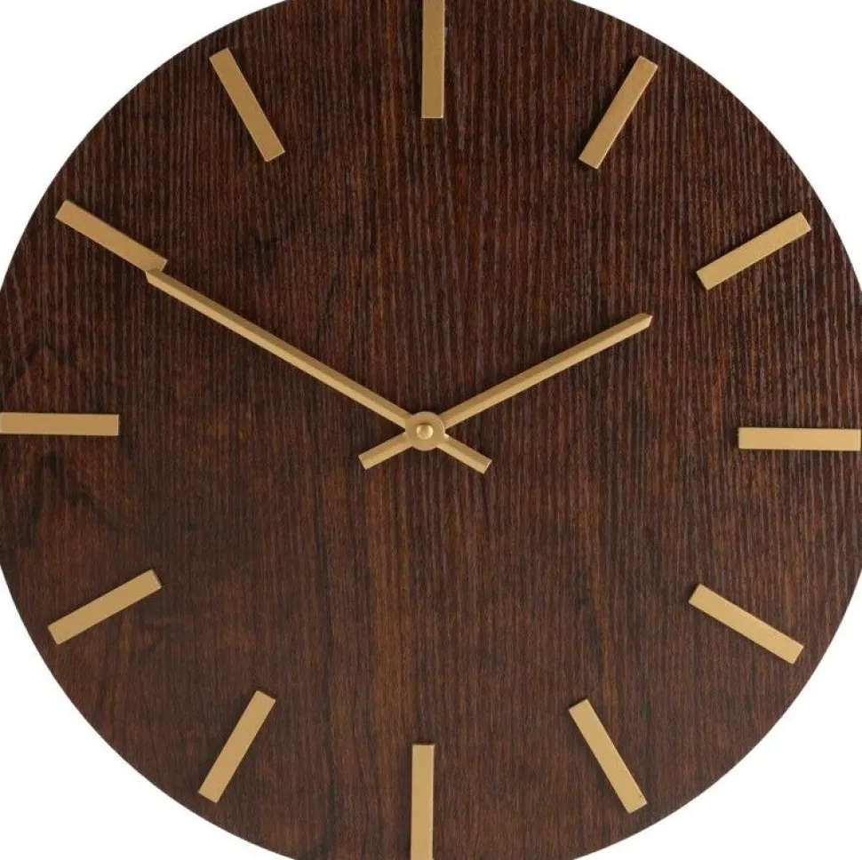 Diese Uhr hat eine natürliche dunkle Holzfarbe und kann daher mit vielen verschiedenen Einrichtungsstilen kombiniert werden. Die Stunden auf der Uhr werden in goldenen Streifen angezeigt, was ihr ein elegantes und ruhiges Aussehen verleiht. Die Uhr funktioniert mit 2 AA-Batterien, die nicht im Lieferumfang enthalten sind.