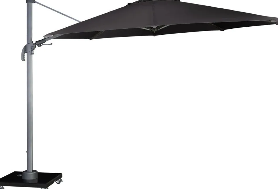 Dieser Ampelschirm wird ohne Ständer geliefert. Kombiniere den Schirm mit dem passenden ‚Kreuzfuß-Sonnenschirmständer Merida Stahl anthrazit‘.