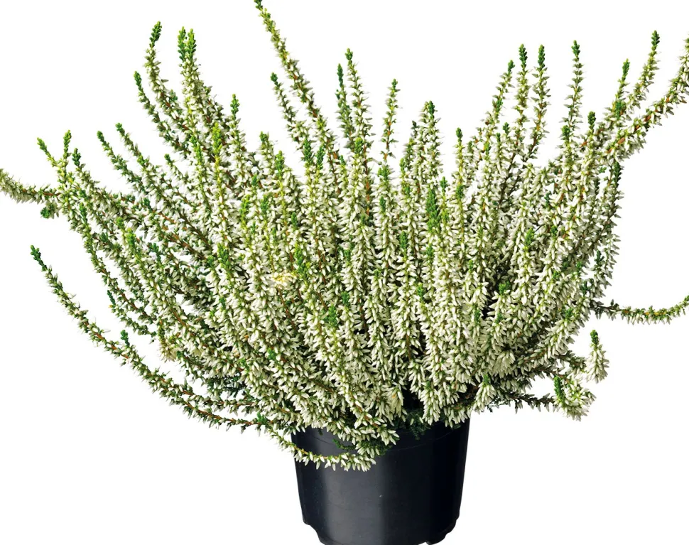 Diese Garden Girl Besenheide hat die Farbe weiß und immergrüne Zweige. Sie ist im Herbst leicht an den vielen, zarten kleinen Blüten zu erkennen, die üppig blühen. Die Farben reichen von hellem Lila über Violett bis hin zu dunklem Rosa.