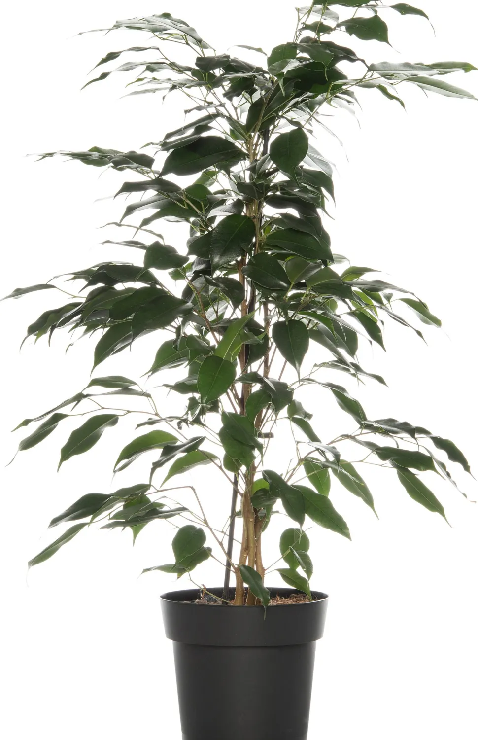 Der Ficus mag keine Kälte und fühlt sich am wohlsten, wenn die Temperatur konstant ist. Die Birkenfeige Ficus benjamina ist eine der bekanntesten Arten, die sich als Zimmerpflanze eignen. Sie hat kleine glatte Blätter Äste, die ein wenig nach unten hängen. Stellen die Birkenfeige an einen hellen Platz, aber nicht in die direkte Sonne. Am besten hältst du die Erde immer leicht feucht und gießt den Ficus mit Wasser auf Zimmertemperatur. Zu viel Wasser mag die Birkenfeige ebenso wenig wie Zugluft; beides kann dazu führen, dass die Birkenfeige ihre Blätter abwirft. Ficus benjamina ‚Danielle‘ ist eine kompakte Pflanze mit besonders schönen, dunkelgrünen Blättern.