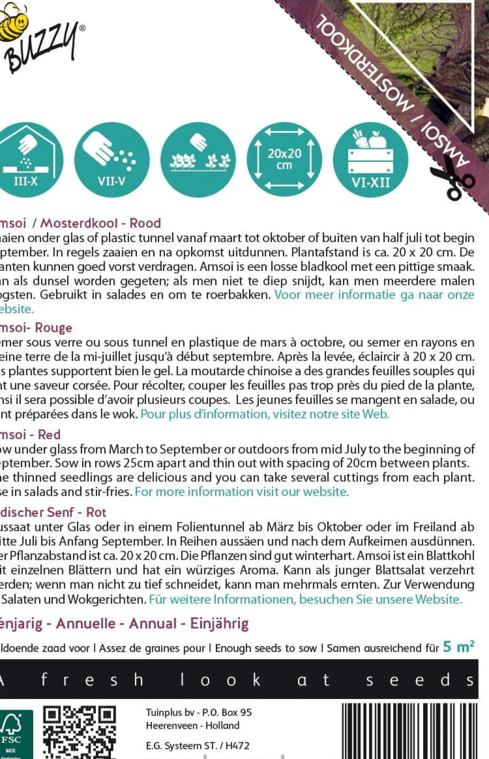 Die Aussaat erfolgt unter Glas oder im Folientunnel von März bis Oktober, oder im Freien von Mitte Juli bis Anfang September. Säe die Senfsaat-Samen in Reihen aus und dünne diese später aus. Der Pflanzabstand sollte ca. 20 x 20 cm betragen. Die Pflanzen können Frost gut vertragen.