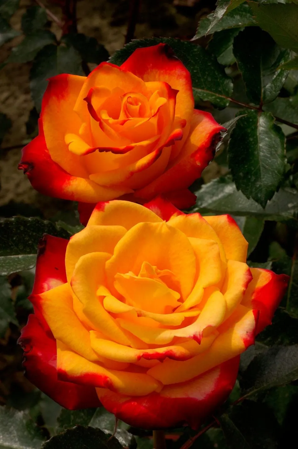 Keine Rose für Zartbesaitete, denn die Blüten vereinen die Farben Gelb und Rot, aber das ist ja auch sehr schön. Es ist typisch, dass der englische Züchter der Rose einen deutschen Namen gab.