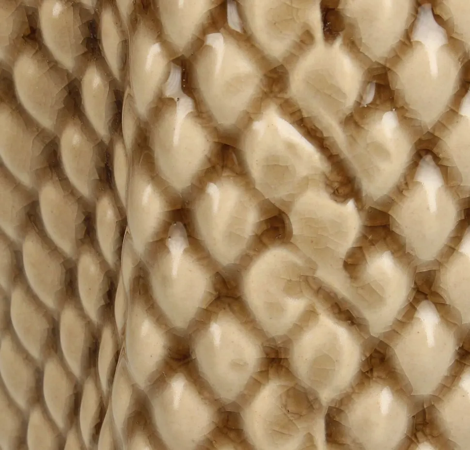 Diese Vase ist braun, wodurch sie eigentlich mit jedem Stil gemischt oder kombiniert werden kann. Die Oberfläche weist ein dreidimensionales Muster auf, das die Textur nicht nur sichtbar, sondern auch angenehmbar fühlbar macht. Das verleiht ihr eine schöne Tiefenwirkung. Außerdem hat sie ein schönes gleichmäßiges geometrisches Muster.