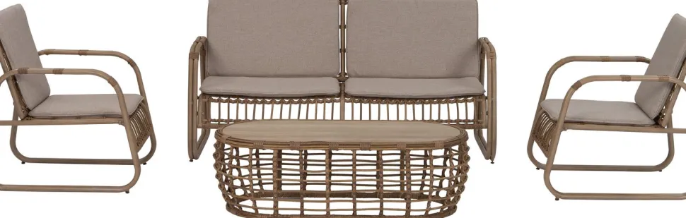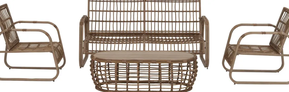 Dieses trendige Lounge-Set Jade aus der Gartenkollektion von Intratuin wird durch seinen schönen Materialmix sicher nicht unbemerkt bleiben. Das Lounge-Set Jade hat einen Aluminiumrahmen und ist handbemalt in der Farbe Teak. Das Gestell ist mit einem Weidengeflecht versehen, das den letzten Schliff gibt. Der Loungetisch hat eine Tischplatte aus Keramikglas. Gemütlich und attraktiv für jeden Garten!