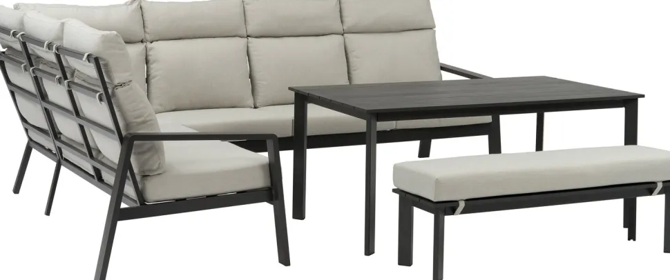 Das Marseille Loungeset ist vielseitig auf deiner Terrasse oder in deinem Garten einsetzbar. Dank der cleveren 5-teiligen Zusammensetzung kannst du das Set ganz nach deinen Wünschen aufstellen: eine 2-Sitzer-Lounge-Bank links (148 x 60 x 93 cm), ein Eckteil (60 x 60 x 93 cm), ein 3-Sitzer-Loungesofa rechts (211 x 60 x 93 cm), ein Esstisch (150 x 87 x 66 cm) und eine praktische Gartenbank (130 x 37 x 33 cm). Die Gesamtgröße beträgt ca. 271 x 208 x 93 cm, also miss gut, dass du genug Platz auf deiner Terrasse hast.