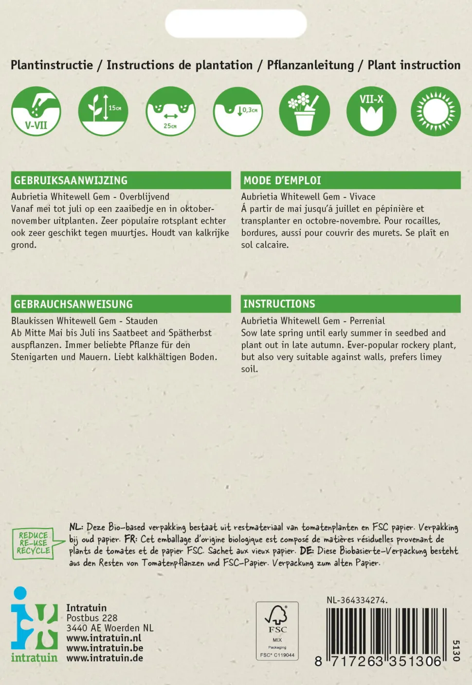 Aubrietia hybrida ‚Whitewell‘ blüht mit kleinen, lila-weißen Blüten im April-Mai. Diese früh blühende Staude wird nicht höher als 10 cm und kann als Bodendecker, Rabattenpflanze oder im Steingarten verwendet werden. Es ist eine schöne Pflanze, die du an einem sonnigen Ort an einer Wand oder über den Rand eines Blumentopfes hängen lassen kannst. Diese Pflanze gedeiht nur in trockenem, luftigem Boden und lässt sich gut mit anderen Frühjahrsblühern kombinieren. Dazu gehören Krokusse, Narzissen und Gänsekresse.