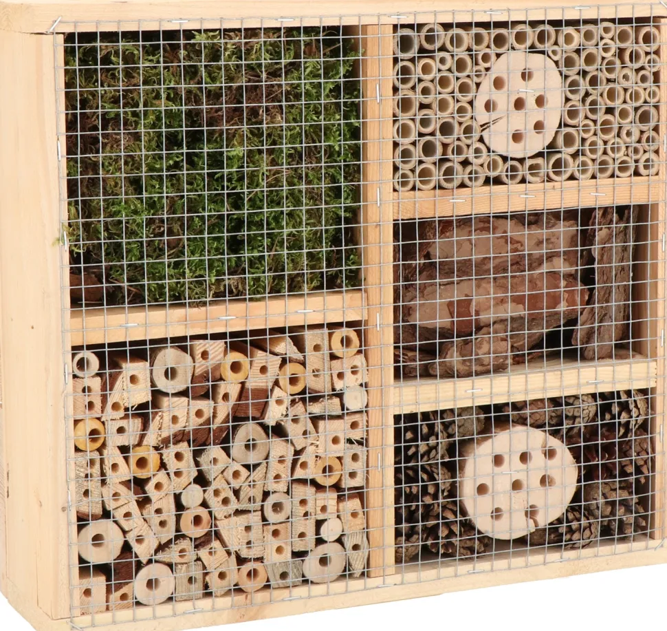 Dieses Insektenhotel besteht aus natürlichem Kiefernholz und ist unbehandelt. Die 5 Fächer sind mit Bambus, vorgebohrten Hartholzzweigen, Moos, Holzrinde und Tannenzapfen gefüllt. Dank der Bohrlöcher auf der Rückseite lässt sich das Insektenhotel leicht aufhängen.
