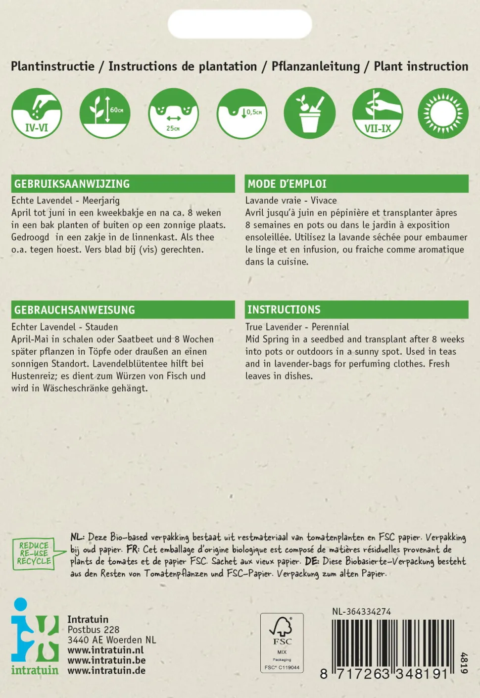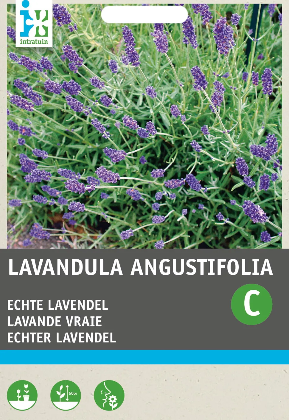 Dieser Lavendel blüht mit blauvioletten Blüten an kräuftigen Stängeln, die Bienen und Schmetterlinge anziehen und herrlich duften. Die Blätter haben eine graugrüne Färbung. Die Lavendelpflanze gedeiht sowohl im Beet als auch im Topf, aber bevorzugt einen kalkreichen, trockeneren Boden. Während der Blüte erreicht der Lavendel eine Höhe von 50-60 cm. Dünge den Lavendel nicht, denn dann wächst die Pflanze in die Höhe und blüht schlechter. Die Lavendelsamen werden von Mitte Februar bis April unter Glas oder zwischen Mitte April und Mitte Juni im Freien gesät. Es kann bis zu vier Wochen dauern, bis die Lavendelsamen keimen. Die jungen Lavendelpflanzen können ab Mitte Mai ausgepflanzt werden und sind winterhart.
