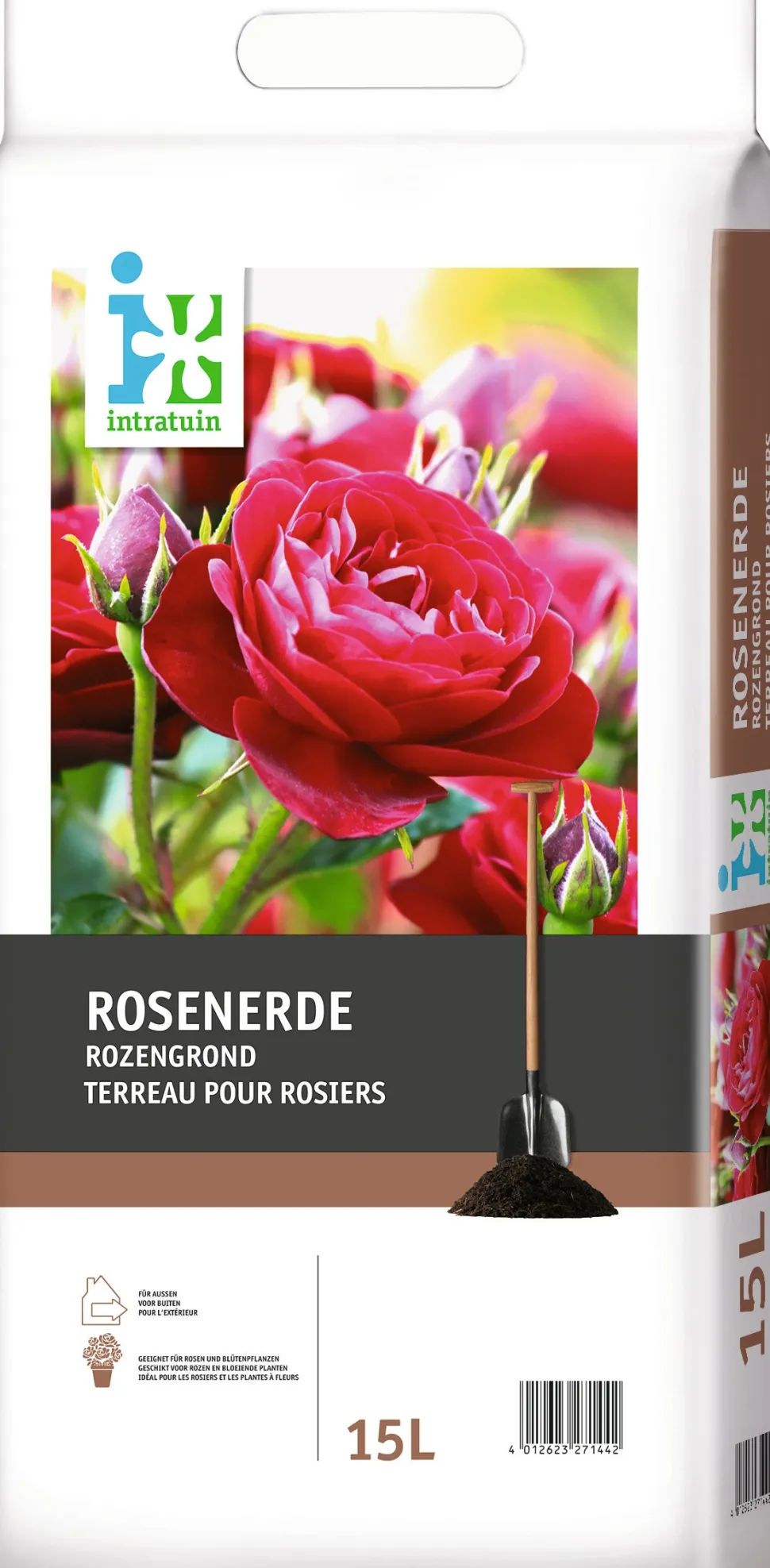 Die Intratuin Rosenerde ist ein gebrauchsfertiges Kultursubstrat für die Aufzucht und Pflege von Rosen in Kästen und Schalen sowie für das Anlegen von Beeten. Deinen Rosen soll es in jeder Lebenslage an nichts mangeln. Der enthaltene Vulkanton und der Humusanteil unserer Rosenerde schaffen beste Bedingungen für ein schnelles Anwachsen. Wasser und Nährstoffe werden gut dosiert und dem Bedarf entsprechend an die Pflanzen weitergegeben. Außerdem fördern die Zusätze eine gute Durchwurzelung. Die Zusammensetzung der Intratuin Rosenerde ist strukturstabil: Deine Rosen haben dauerhaft einen guten Halt.