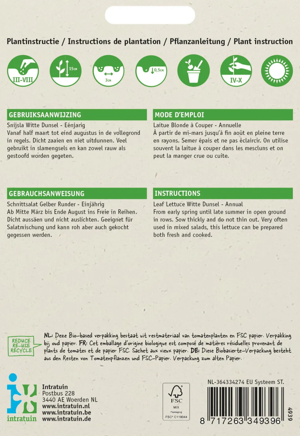 Schnittsalat ist eine weniger bekannte Salatsorte mit weichen und zarten Blättern, die schnell geerntet werden können. Schnittsalat wird normalerweise roh gegessen, kann aber auch zu einem Eintopf oder einer Suppe verarbeitet werden. Diese Sorte bildet keinen Salatkopf im klassischen Sinn, es bleiben lose Blätter, die geerntet werden können wenn sie eine Länge von etwa 10 cm erreicht haben. Die Aussaat kann im Februar-März unter Glas und von März-August im Freiland in Reihen von 10 cm Abstand erfolgen. Nach dem Keimen müssen die Pflanzen nicht ausgedünnt werden, da sie als Schnittsalat geerntet werden und keinen vollen Kopf bilden müssen.