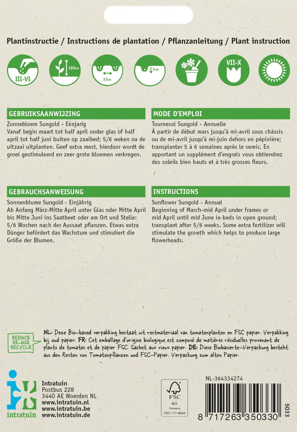 Diese Sonnenblumen-Sorte Heliathus annus ‚Sungold‘ ist doppelblütig und wird 120-180 cm hoch. Sowohl die kurzen Blütenblätter als auch das Herz der Blüte sind gelb. Die Sonnenblumensamen werden Ende März bis Mitte April in Anzuchttöpfen oder einem Anzuchtkasten ausgesät werden. Ab Mitte April bis Mitte Juni kannst du die Samen auch draußen in einem Saatbeet oder direkt am Bestimmungsort ausbringen. Am besten keimen die Sonnenblumensamen bei einer Temperatur von 15-25° C. Bedecke die Samen mit 2 cm Erde und einer Plastikfolie, damit sie nicht von Mäusen oder Vögeln gefressen werden. Die jungen Sonnenblumenpflanzen wachsen schnell, so dass man sie bereits 5-6 Wochen nach der Aussaat mit einem großzügigen Pflanzabstand auspflanzen kann. Deze zonnebloemen bloeien in augustus-oktober und staan graag op een zonnige plaats. Zet deze hoge planten achterin de border of combineer ze met siergrassen und hoog groeiende vaste planten.