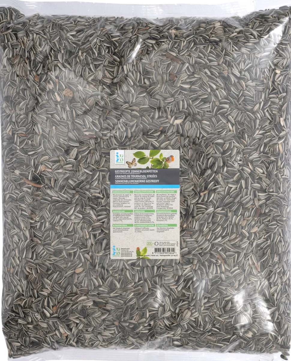 | Inhaltsstuffe | Gestreifte Sonnenblumenkerne. Analytische Bestandteile: Rohprotein 14 %, Rohfett 29,1 %, Rohfaser 28,5 %, Rohasche 2,7 %. |