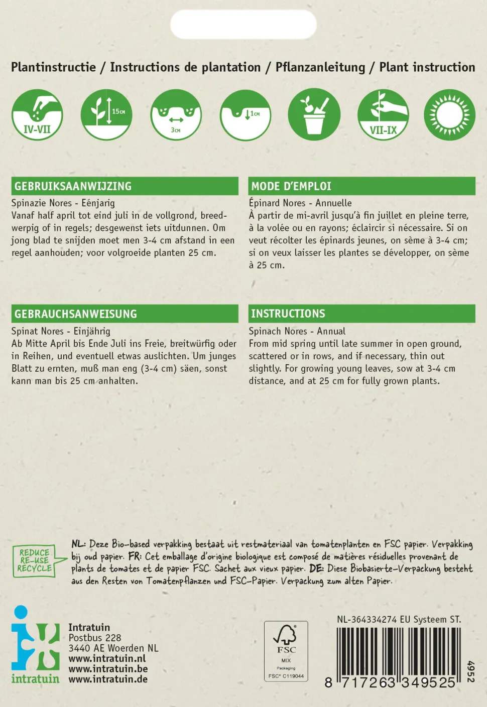 Spinat ‚Nores‘ hat sehr große, dunkelgrüne Blätter und wächst recht langsam. Diese Sorte hat runde Samen und schießt nicht so schnell. Daher ist sie für den Sommeranbau geeignet. Nores‘ ist resistent gegen die Pilzkrankheit ‚Wolf‘ und hat zarte Blätter mit einem guten Geschmack. Von Mitte März bis Mitte Juli kann im Garten ausgesät werden, entweder breitwürfig oder in Reihen mit 10 cm Abstand. Lockere den Boden vor der Aussaat gut auf und arbeite etwas stickstoffhaltigen Dünger ein.