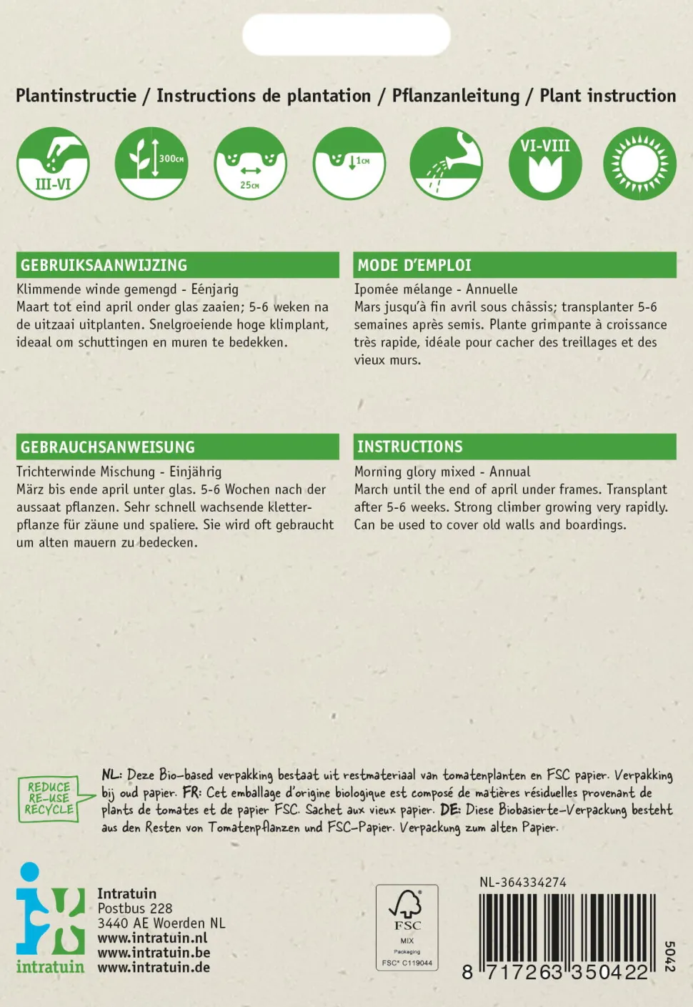 Die Trichterwinde wird in England ‚Morning Glory‘ genannt. Das bezieht sich auf ihre schönen Blüten, die nur morgens in ihrer vollen Pracht blühen. Jede Blume blüht nur einen Morgen, aber da es so viele von ihnen gibt, spielt das keine Rolle. Diese gemischte Auswahl bekommt trompetenförmige Blüten in verschiedenen Farben und kann meterhoch klettern. Dafür braucht sie eine Stütze, um die sich die Ranken winden können, z.B. einen Wigwam aus Stöcken. Die Blätter dieser einjährigen Kletterpflanze sind herzförmig.