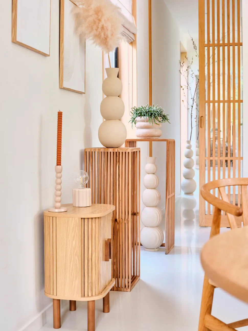 Die Vase ist in verschiedenen Größen und Farben erhältlich. Diese beigefarbene Vase misst 20 x 20 x 76 cm.