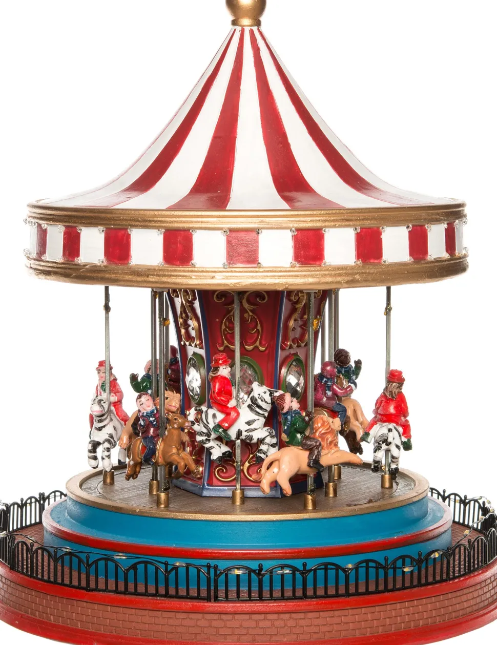Diese Weihnachtsdorf-Miniatur passt perfekt auf den Weihnachtsmarkt oder Jahrmarkt in deinem Weihnachtsdorf. Das Karussell macht Geräusche und bewegt sich. Am Zaun und an der Oberkannte des Karussells hängen Lämpchen, die für stimmungsvolle Beleuchtung sorgen. Die LED-Beleuchtung wird über einen Adapter betrieben, der im Lieferumfang enthalten ist. Das Kabel ist schwarz und die LED-Lämpchen erzeugen warmweißes Licht. Das bunte Karussell ist aus Kunstharz gefertigt. Kombiniere unterschiedliche Miniaturen und baue dir so dein einzigartiges, lebendiges Weihnachtsdorf.