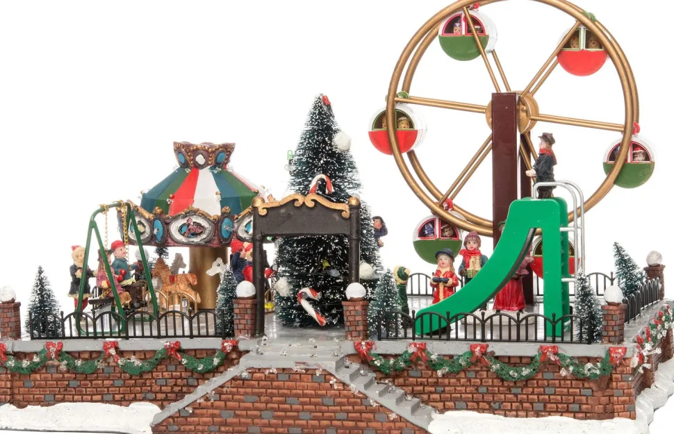 Dieser Miniatur-Vergnügungspark sorgt für ausgelassene Weihnachtsstimmung in deinem Weihnachtsdorf. Dank Musik, Karussel und Riesenrad lässt sich in diesem Vergnügungspark immer etwas erleben. Das Karussel dreht sich und ist mit weißen LEDs beleuchtet. Zudem befindet sich in dem Vergnügungspark ein Weihnachtsbaum, der mit bunten LED-Lämpchen in verschiedenen Farben beleuchtet ist.