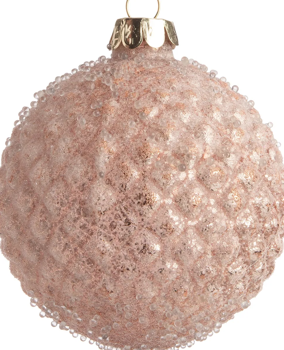Schmücken deinen Weihnachtsbaum auf traditionelle Art und Weise! Mit diesem Weihnachtsbaumschmuck liegst du immer richtig. Die Weihnachtskugel aus Glas hat eine schöne altrosa / goldene Farbe. Das feine Relief aus Rauten und die zarten Perlen auf der Oberfläche machen diese Weihnachtskugel extravagant und besonders. Stilvoll, klassisch und passend für jeden Weihnachtsbaum. Diese Kollektion verspricht fröhliche Weihnachten!