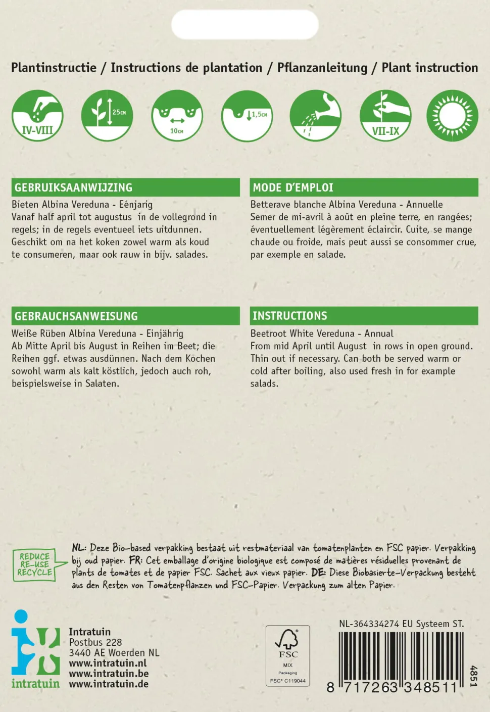 Die weiße Rübe hat einen süßen und saftigen Geschmack, der etwas feiner ist als der der roten Rübe. Die Sorte ‚Albina Vereduna‘ ist für den Sommer- und Herbstanbau geeignet. Rüben können nicht verpflanzt werden und werden daher direkt in den Garten und an den richtigen Standort gesät. Der Anbau im Gewächshaus ist ebenfalls möglich, in diesem Fall solltest du im Februar/März säen. Wähle einen Platz in der Sonne oder im Halbschatten. Hast du schweren Lehm in deinem Garten oder ist der Boden ziemlich nass? Dann baue die Rüben in mit grobem Sand verbesserten Hochbeeten an. Die eigentliche Rübe ist eine Wurzelknolle, die unter der Erde wächst. Diese weiße Rote Bete ist eigentlich ein „vergessenes Gemüse“, das du mit diesem Samentütchen wiederentdecken kannst.