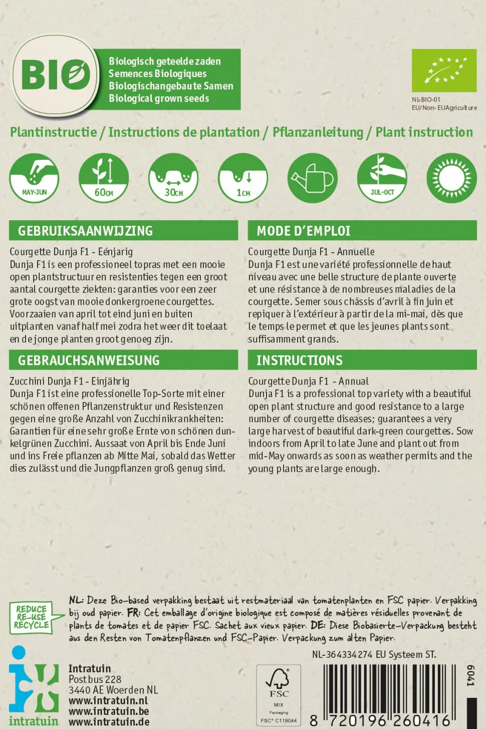 Diese Zucchini bekommt grüne Früchte mit gutem Geschmack. Diese Sorte ist selbstbestäubend, so dass die Erträge hoch sind. Man kann sie Mitte April im Gewächshaus aussäen, in Töpfe pikieren und Mitte Mai ins Freie pflanzen. Du kannst sie auch Mitte Mai im Freiland in gut gedüngte Erde säen und im Juni an einem geschützten Ort auspflanzen. Die Früchte werden am besten in einem jungen Stadium geerntet, wenn sie 15-20 cm lang sind. Die Pflanze bildet dann noch einige Zeit lang neue Früchte. Die Pflanzen mögen einen warmen, sonnigen Platz. Im Unterglasanbau kann von Mitte Mai bis September geerntet werden, im Freilandanbau von Juli bis Oktober.
