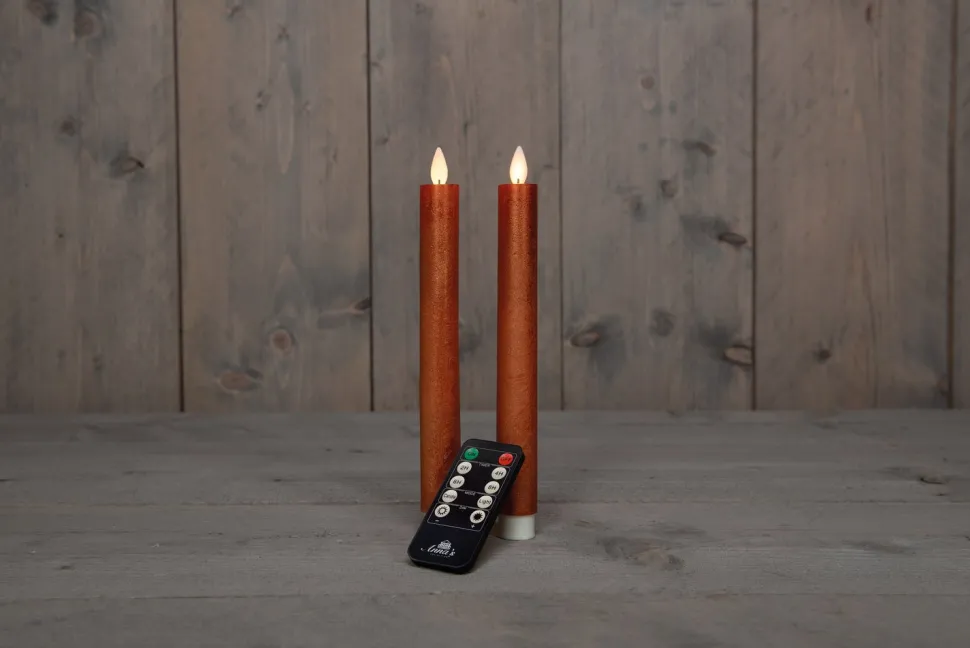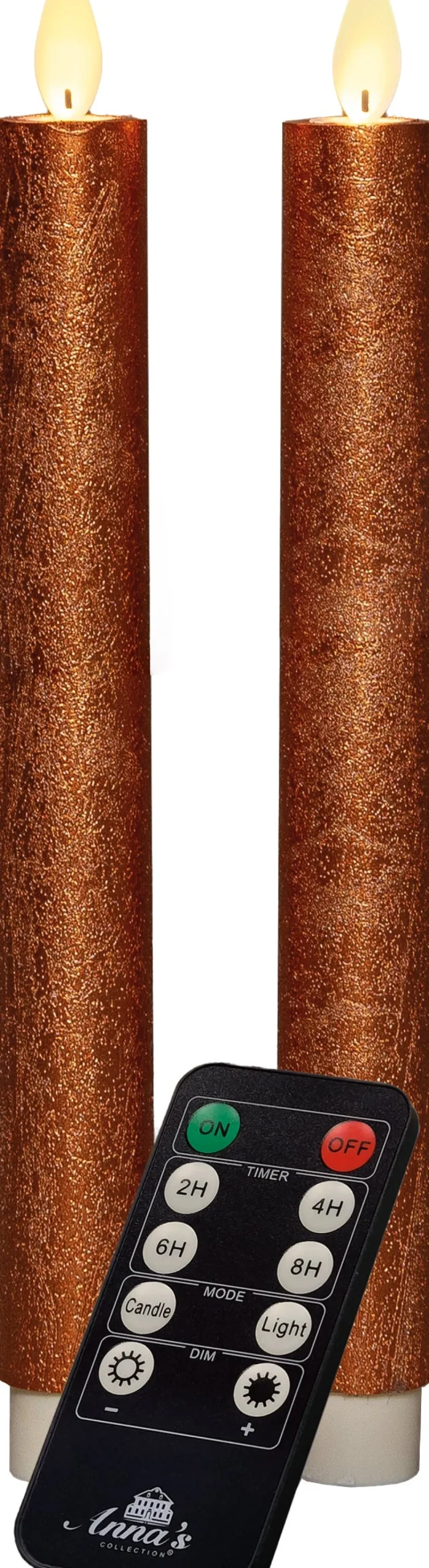 Diese 2 Stabkerzen haben LED-Lämpchen und lassen sich bequem mit der mitgelieferten Fernbedienung ein- und ausschalten. Die LED-Stabkerzen in der Farbe Kupfer sind batteriebetrieben, haben eine bewegliche Flamme und sind 23 cm lang. Erhältlich in versc