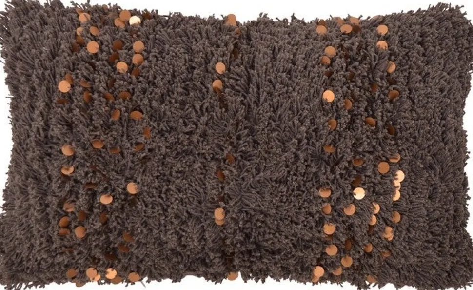 Das längliche Kissen Boston hat eine warme braune Farbe. Zwischen den weichen Fransen des Kissens sind farblich passende große Pailetten zu finden, die für einen spielerischen Effekt sorgen.