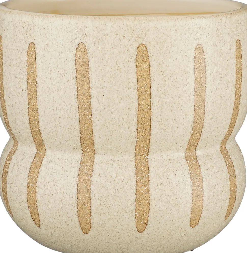 Modern und zeitlos – so lässt sich der Ibis-Blumentopf von Mica Decorations am besten beschreiben. Der Topf ist aus Keramik gefertigt und hat eine cremefarbene Farbe mit braunen vertikalen Linien. Stell ihn auf die Fensterbank oder in die Mitte des Tisches und setze deine Lieblingspflanze hinein! Der Blumentopf Ibis hat eine runde Form und ist in verschiedenen Größen erhältlich. Dieses Modell hat eine Höhe von 19 cm und einen Durchmesser von 20 cm.